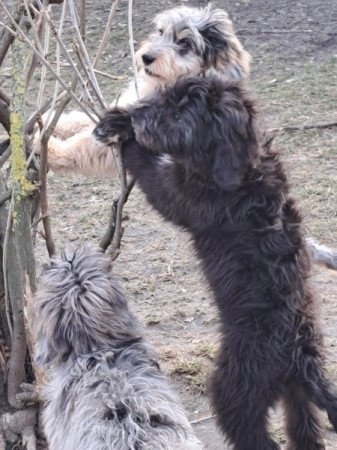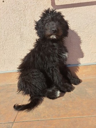 Feher fekete Aussiedoodle F1. Alacsony energiájú kutya. Minimális szőr hullajtású.