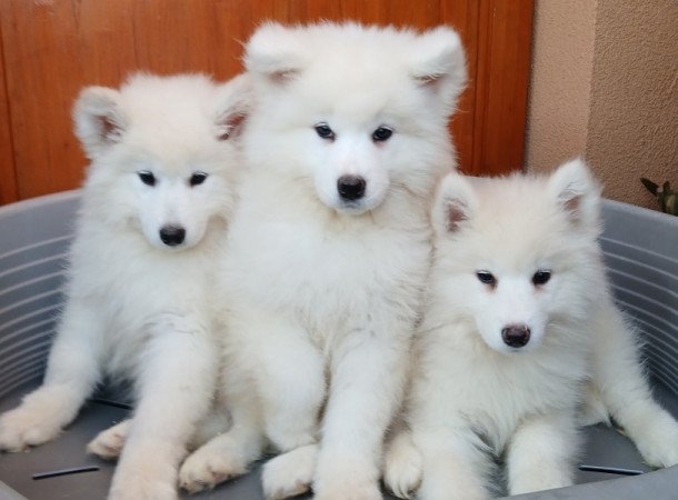 A képen látható samoyed 10 hetes kislány kutyusok gazdit keresnek. Két oltással, rendszeresen féreghajtva, chippelve kerülnek új helyükre.
