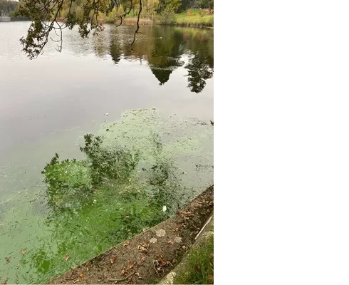 Zöld pikkelyek, zöldes csomók vagy barna pöttyök egy tóban, tavacskában vagy patakban.